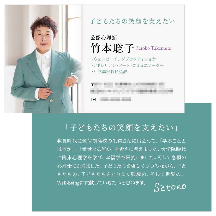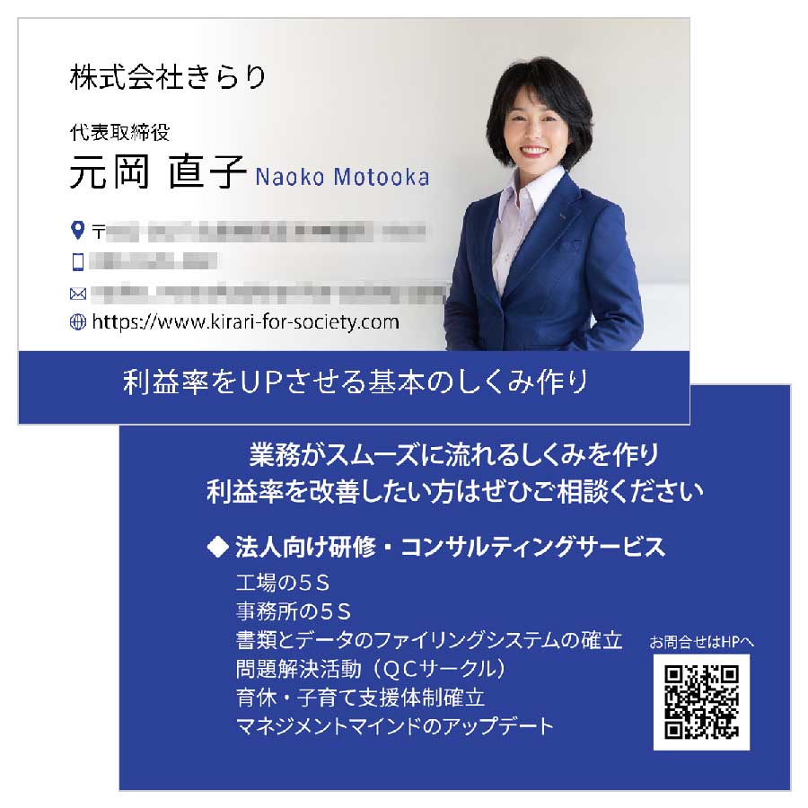 特に、ビジネスのクラス感を引き上げる「パーソナルカラースーツ」のオーダーとあわせて撮影からご依頼いただくケースが増えており、全体のブランディングとしても非常に効果的。もちろん、お手持ちの衣装や写真を活用しての名刺制作も可能です。